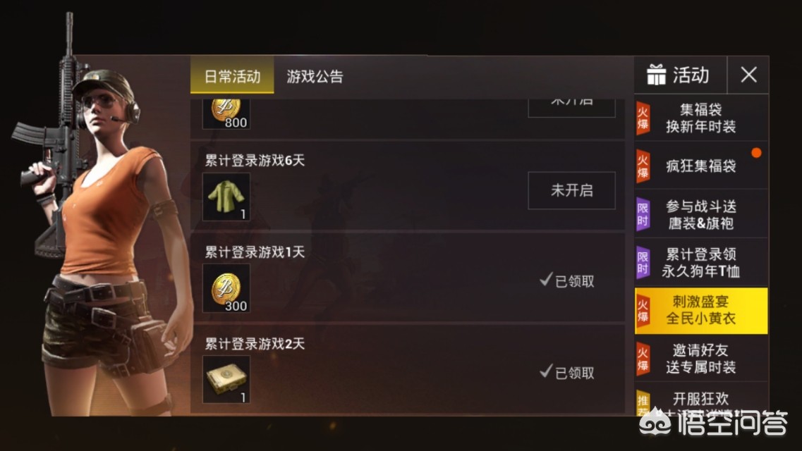 在游戏左边的活动界面我们可以看到所有的活动,有的活动很容易理解,比如累计登录活动,累积登录3日即可领取百褶超短裙,这个超短裙目前在绝地求生端游中售价在1400左右。累积登录6天送小黄衣,小黄衣是绝地求生端游中最物美价廉的服饰,人见人爱,花见花开,不信的话你往广场上一站,肯定很多人会对你说“哥们,把你的小黄衣脱下来让我穿穿”。