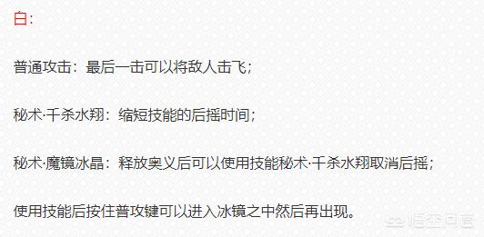 这次的白确实加强了,普攻僵直不够,只能起到牵制作用,加强后最后一下普攻可以击飞,不用担心平A的时候会被敌人起手到。秘术·千杀水翔:缩短技能的后摇时间。秘术·魔镜冰晶:释放奥义后可以使用技能秘术·千杀水翔取消后摇;使用技能后按住普攻键可以进入冰镜之中然后再出现。虽然近战依旧是白的缺陷,但是无疑这次确实加强了不少
