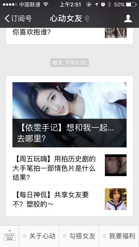2、心动女友,真人视频版恋爱养成,这个不算奇怪,奇怪的是她有微信公号,并且定期更新动态和照片,召唤她的男友们...就是下面这个