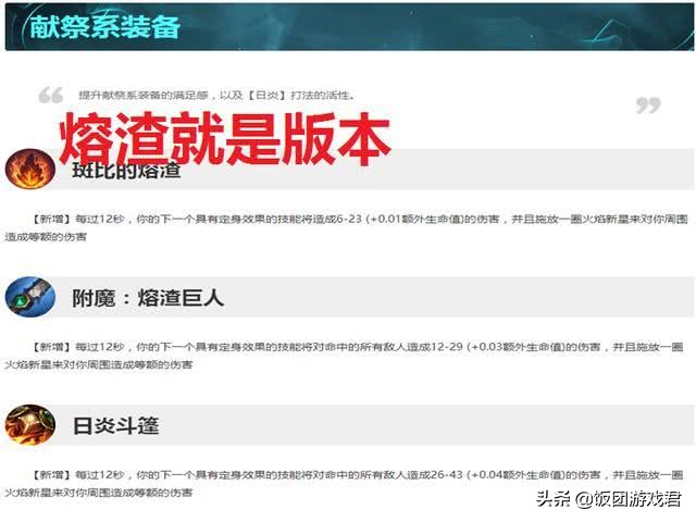 国服刚刚更新联盟最新版本,这次的版本更新,我比较关注的有两个点,一个是将上奶妈进行削弱,这一排位毒瘤英雄终于是从上单位置离开,另一方面,熔渣得到史诗级别的加强,除基础属性得到优化外,还获得了一个非常强的被动,熔渣瞬间成为各大战士及肉坦英雄的必出装备。