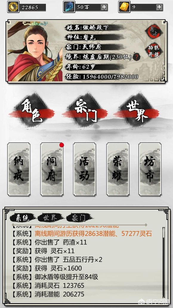 与上面一款游戏相比,这款游戏会更加的丰富而复杂,游戏同样是以打坐吐纳获取修为,玩法方面更加偏向于冒险闯关,有各种不一样的地图和副本,玩家们可以通过探索获得灵石与修为点以及材料,用于升级装备、技能灵根等,而门派方面这款游戏做的很丰富,随着境界的不断提升,你也可以加入更强大的门派,甚至是你可以自己创建门派等。