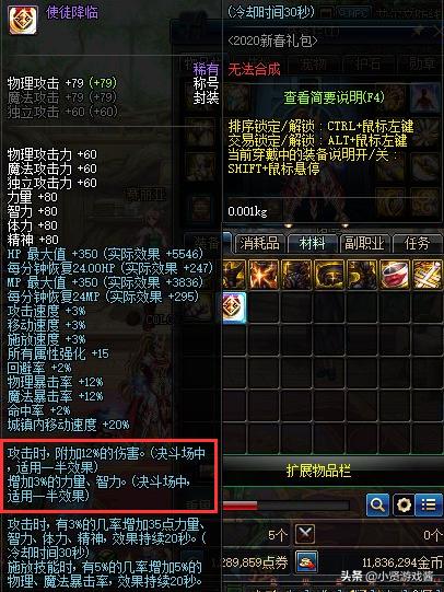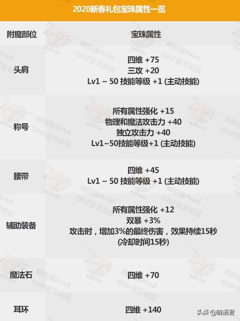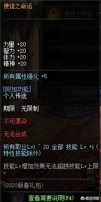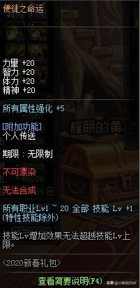 光环和去属强一样,都是20四维,+5属强,1~20技能+1,属于过渡光环,对大号没什么用处,可以给小号。