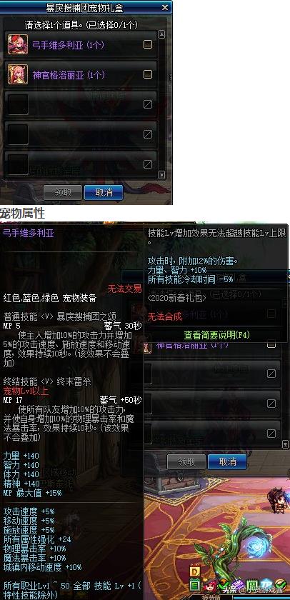 今年的春节宠物一个叫弓手维多利亚,一个叫神官洛洛丽亚,都是可爱的妹子,担是这次宠物比可以说是本次礼包提升最大的道具,相比去年多10%的力智,20的四维,提升非常大。