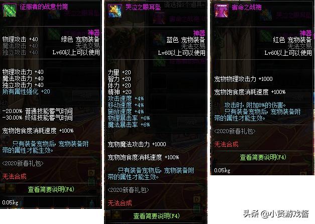 今年宠物装备每个属性相比去年都有得到改变,绿色增加10的物魔攻,蓝色增加20的四维,红色多1%的白字,三个都有提升但提升不大,推荐都有的小伙伴可以给小号使用,细节党除外。