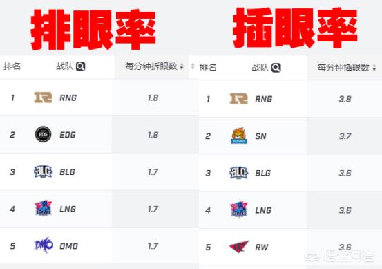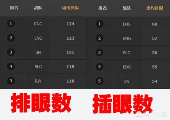 反观插眼数和排眼数排名靠前的战队,他们在比赛中的成绩不算太差。在这个偏向于运营的版本中,视野显得各位重要。注意看比赛的同学应该能够很直观的看出,以运营著称的LCK赛区,SKT战队或者KT等队伍,他们回家最重要的补给就是眼,辅助宁愿多买一个眼出门也不会选择出一件装备,而IG则不同,宁愿多买一个装备和药水也不想多买一个眼,这就是他们最大的短板。