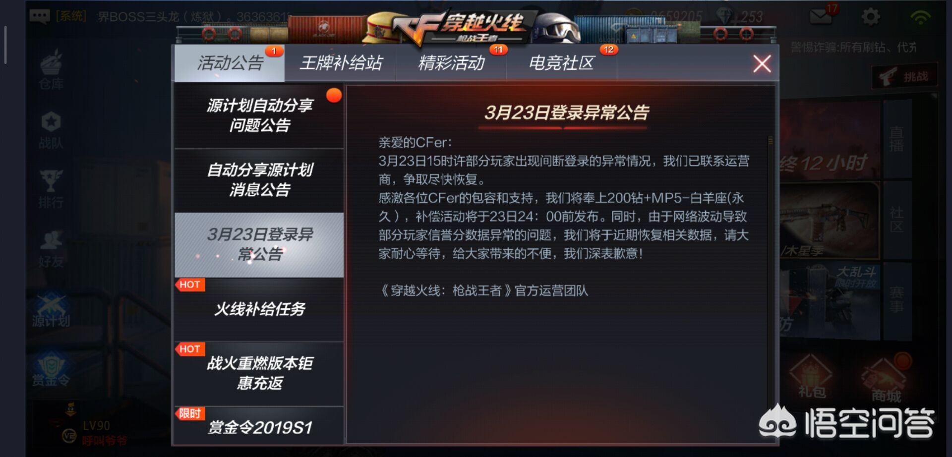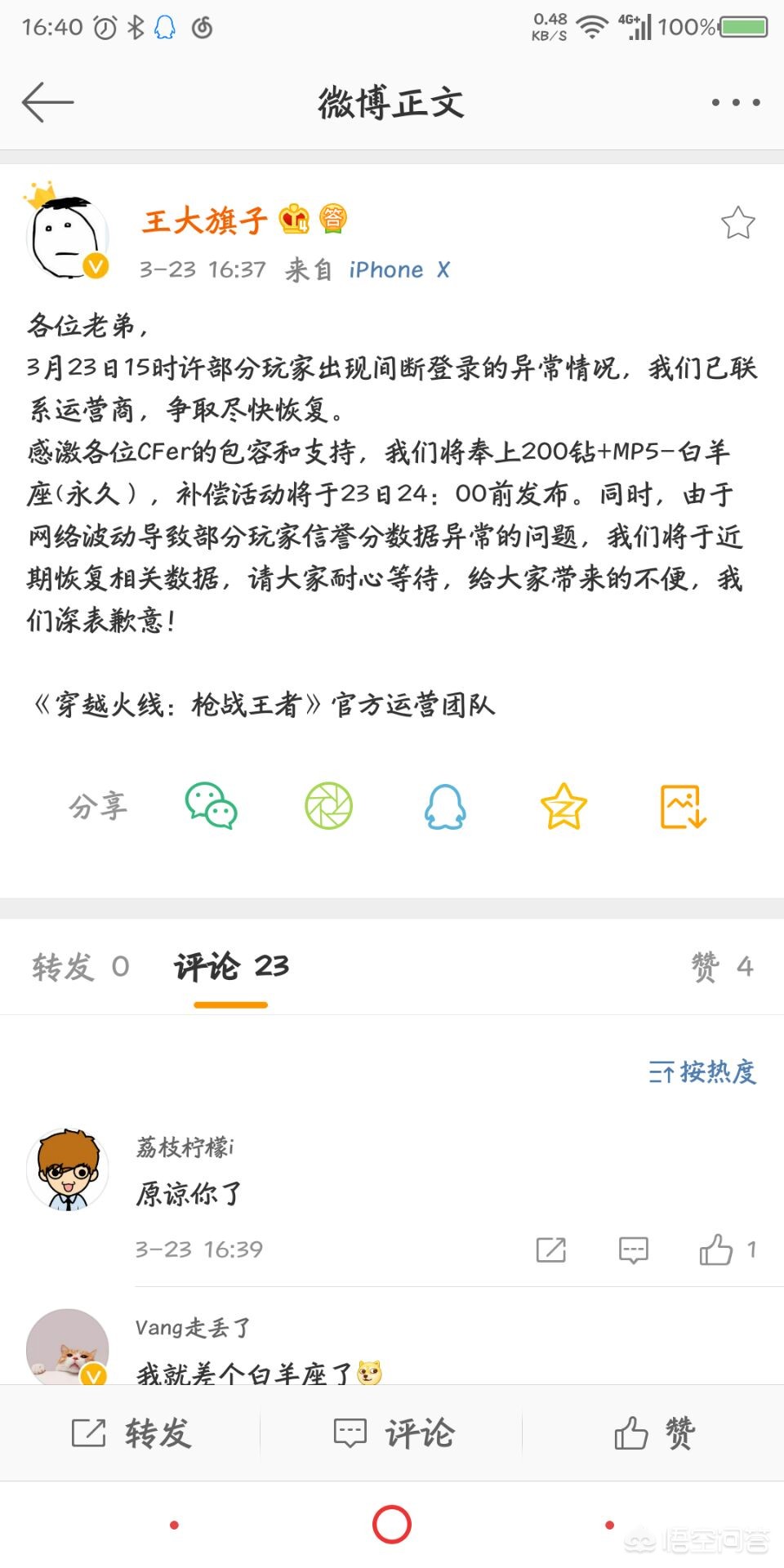 这次的事故呢也是让人意想不到的,不光是CF手游登录不了,所有腾讯旗下的游戏都瘫痪,那么CF手游官方微博和策划等等都在微博说明了这件事情, 对此次事故造成的诸多影响还请玩家们能够谅解,当然补偿奖励由最开始的100钻石增加到200钻石外加白羊座MP5,应该说是补偿奖励还算到位吧,希望各位玩家理性对待此次事故,不要无中生有,至此结束。