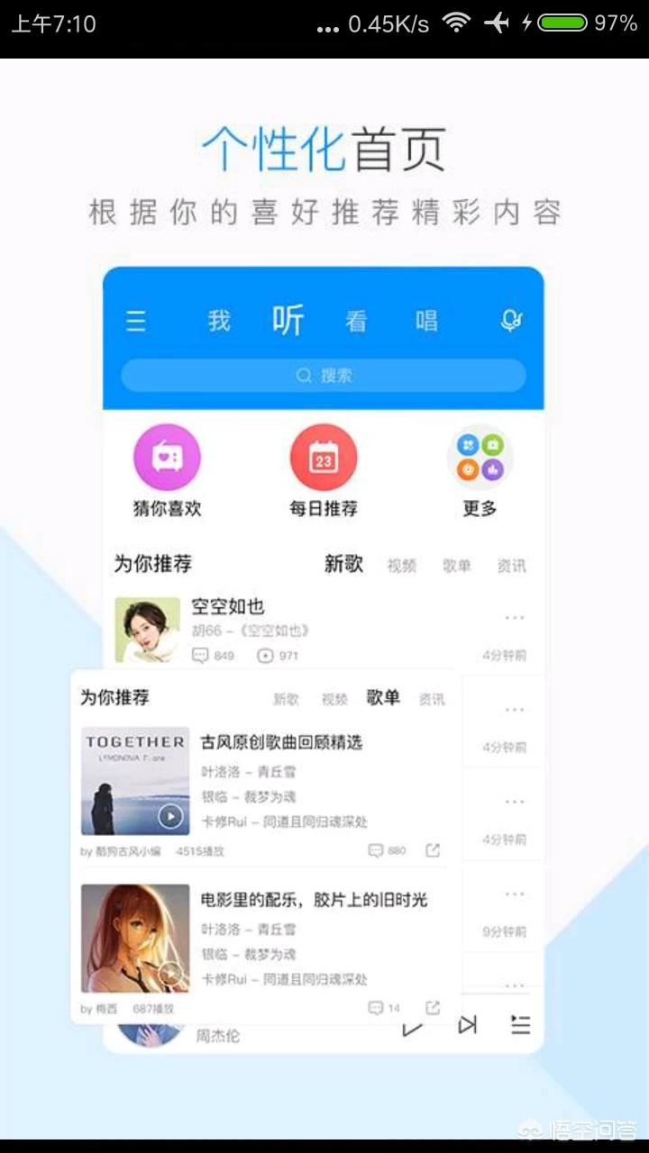 酷狗音乐的歌比较全,UI做的不错,对于高配手机很合适。