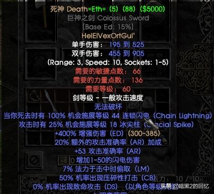 5凹槽白色剑或斧子。顺序:15#+1#+26#+9#+25#。选择底材最好是无形的巨神之剑,因为野蛮人可以单手装备双手剑。高输出,高达50%CB,高DS,7%LM。搭配2孔年纪镶提速珠,非常给力。
