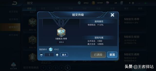 但是在小马看来,这个铭文的削弱可能性不大,本来10个夺翠16%的吸血就不算高,再削的话不光对于射手更是对于其他刺客也不利,而且目前官方也没有任何对于铭文调整的公告。