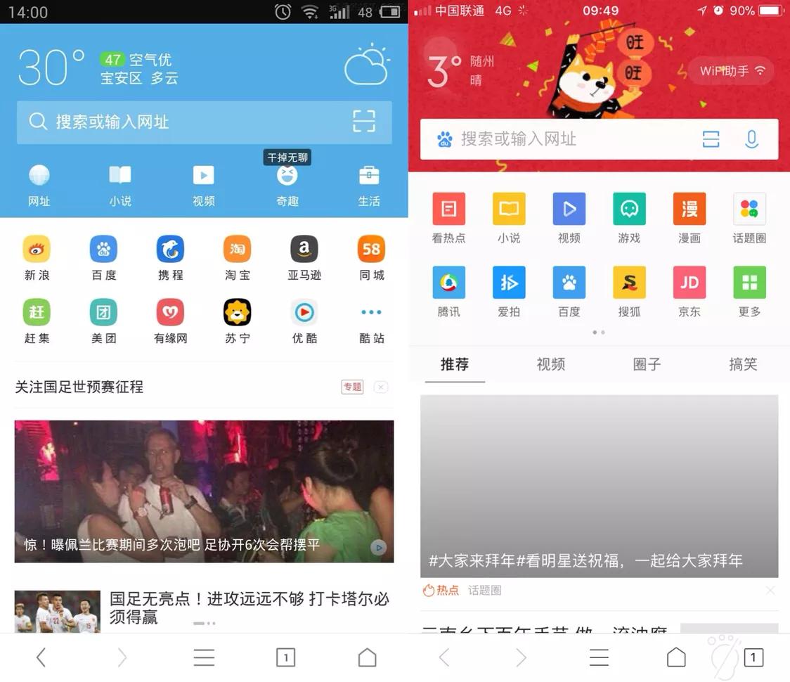 以前洛基亚塞班年代,最牛的浏览器是UC。后来进入智能机时代,UC逐渐发展成了百宝箱,集成的功能太多,变得十分臃肿。而QQ浏览器的诞生,来自腾讯一贯作风——COPY。而复制的对象正是市场占有率极高的UC浏览器,因而也把UC浏览器的臃肿复制了下来。下图左UC浏览器右QQ浏览器,完全相同。