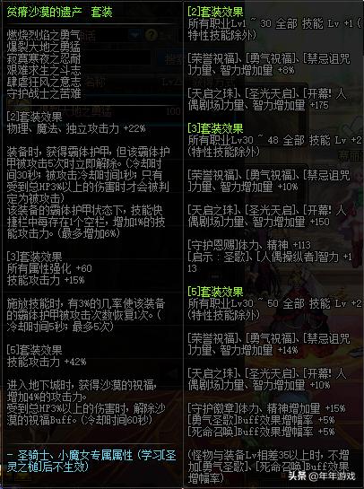 85版本用过手搓武器的玩家手搓自然算不上问题,更何况这套防具还可以有8个技能放到快捷栏里,不过两条被击减伤属性还是挺要命的,占了整整10%的技能攻击力,神话上衣提供了每15秒被击次数恢复一次和减少沙漠祝福BUFF15秒CD,对于维持全程满状态意义不小。