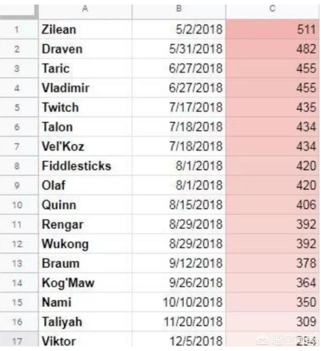 这张图显示了最近一段时间长时间没有进行过更新或者改动的英雄,其中最长的基兰和德莱文已经有511和482天没有进行过更新改动了。