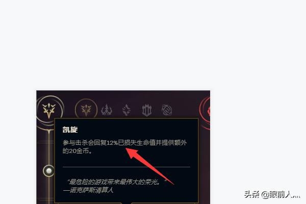 2、然后我们点出凯旋来增加鳄鱼在团战的回复生命的能力,因为这个符文只要参与击杀(也就是击杀或者助攻)就可以回复血量,所以团战比较有用,毕竟团战起来暴发人头还是挺简单的。