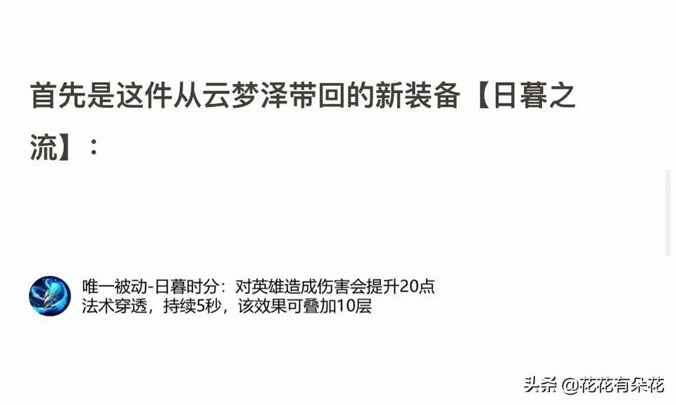 而叠满被动后的日暮之流,可额外增加200点法术穿透,伤害非常爆炸,并且它与痛苦面具可相互联动联动,非常适合伤害频率高的英雄。