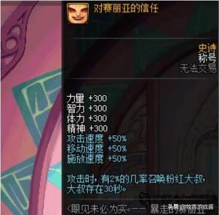 瞅瞅这个称号有多给力,四维加300,三攻加50%,奶爸奶妈的最佳称号,带到150级版本都有可能。这可是全服唯二的史诗称号哦,什么天选之人、神选英杰才是传说级别哦。