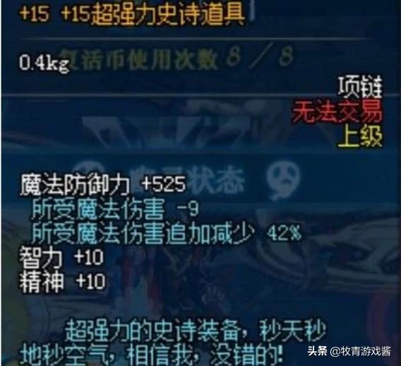 而在最近就有这么一位玩家晒出了“+15史诗”装备的玩家,这位玩家表示自己当时在强化这件装备的时候运气来了一路上到15钱不够才算了,可想而知如果他钱够了话绝对不止上15,不过我们在这个+15的超强力史诗道具的属性中却发现了端倪,为什么这件首饰没有等级,而且+15的史诗却不加一点抗磨和魔防呢?