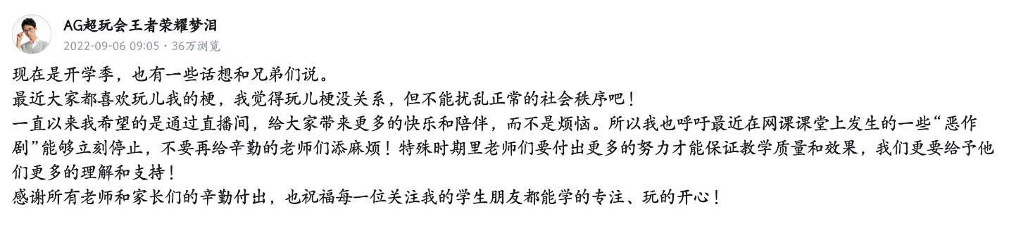 梦泪本人对这个梗一开始是很开放,一起跟着玩的态度。但是就在这两天,很多人顶着这个梦泪终极猎手的头像混入网课群,放那首音乐严重干扰课堂秩序,所以梦泪发了动态。