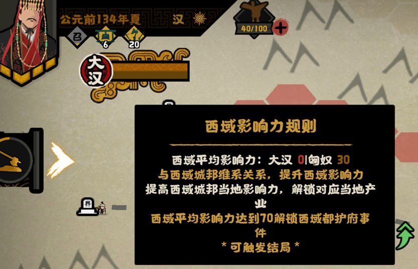 1、【西域都护】:和亲阶段-河西争夺-西域都护府事件完成后选择安定西域,触发事件结局