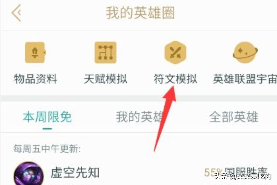 4、我们在【拥有的英雄】页面上方可以看到四个实用的功能,分别是:物品资料,天赋模拟,符文模拟和英雄联盟宇宙。点击符文模拟可以开启符文模拟器,可以查看英雄联盟全部的符文。