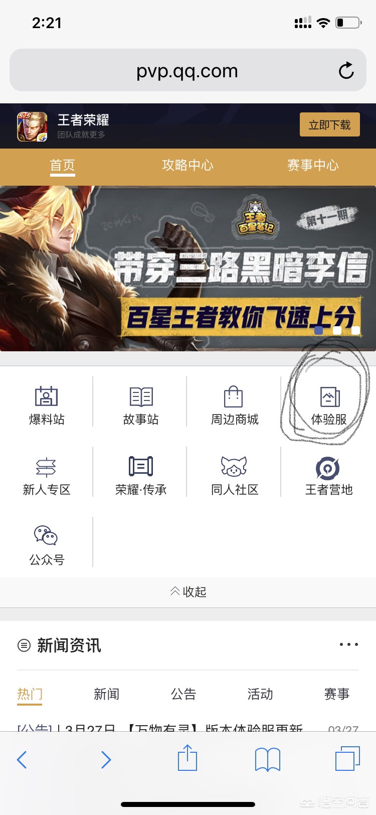 如果你实在找不到,你进入官方网站有每天更新王者荣耀新闻的地方,这个板块的右边就可以找到体验专区。