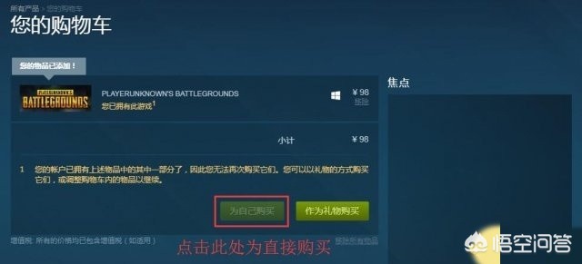 5.点击后会成功将游戏添加到你的购物车中,如果没有其他需要直接点击为自己购买即可,你也可以在这里为一起吃鸡的朋友购买礼物,赠送游戏给他一起开黑。