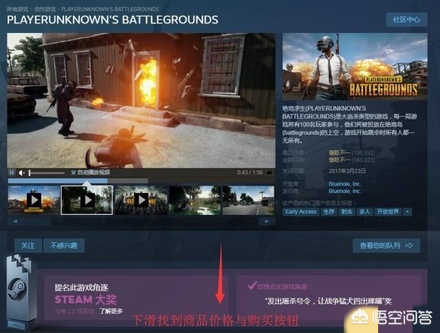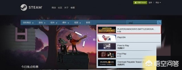 1.首先前往steam的官网按照 Steam注册账号方法 进行账号注册,登录后在steam的搜索栏搜索2.输入"play",第一个搜索结果就是绝地求生大逃杀,点击即可进入绝地求生的商品详情页.