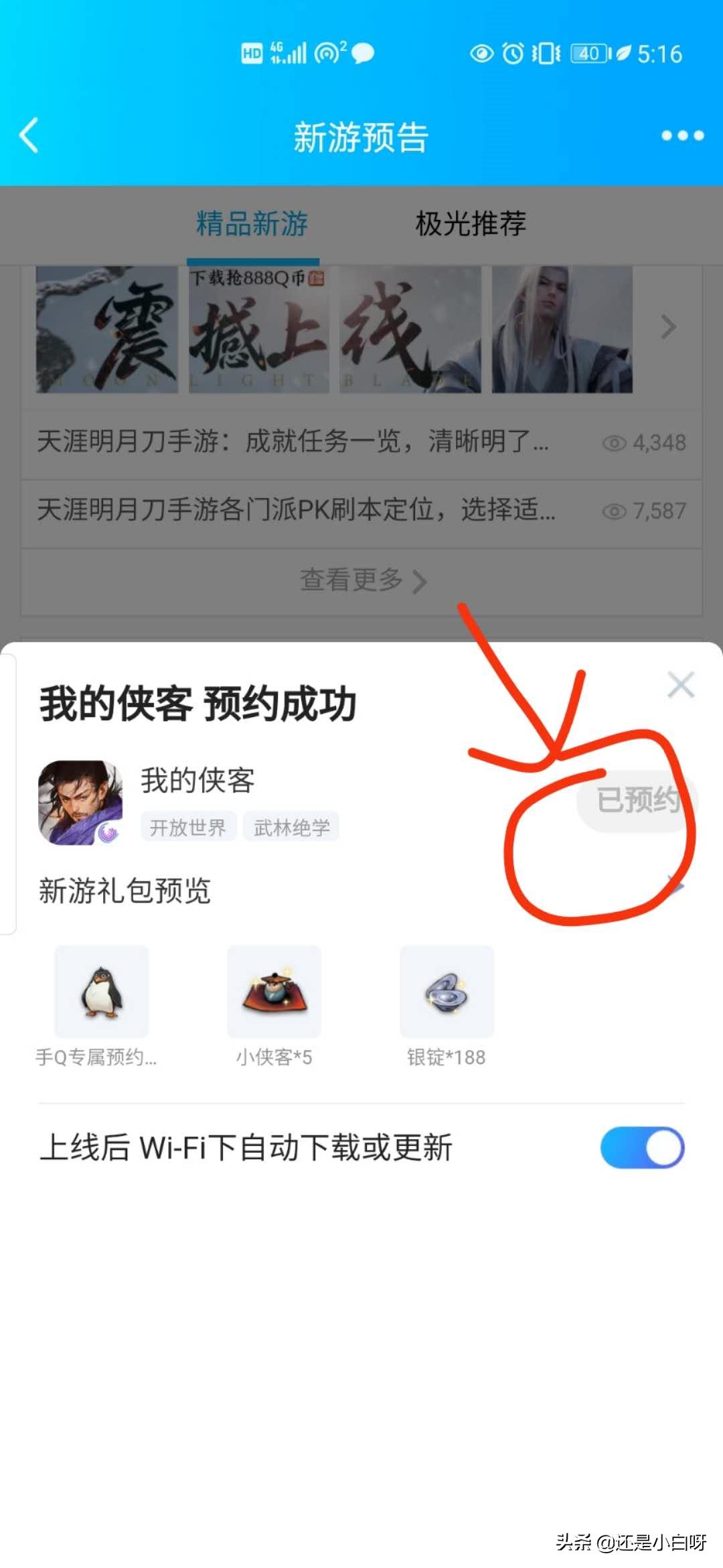 5、我们向下拉动页面,找到想要预约的游戏,点击游戏右侧的“预约”按钮,系统会弹出预约成功的提示框,这就说明我们已经通过手机QQ预约了该游戏,等游戏发布的时候就能够获得预约礼包。