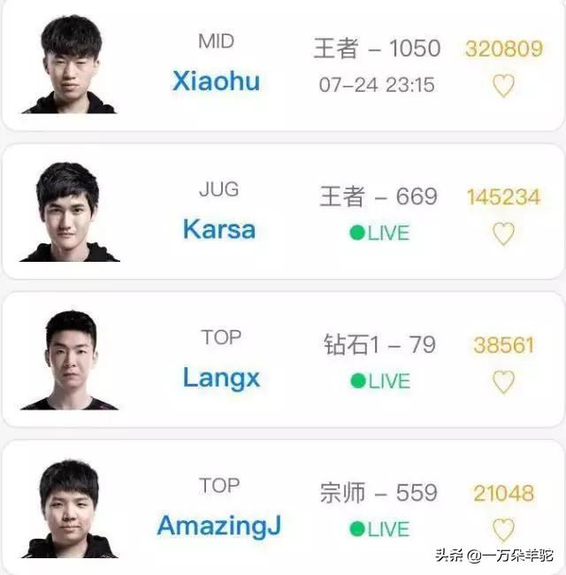 从此图先看狼行Langx,你没有看错,RNG上单狼行是钻一选手,值得一提的是RNG替补上单AJ是宗师,即便如此RNG教练组还是让钻一上单Langx首发出战,以此可见段位确实没有多大用处。