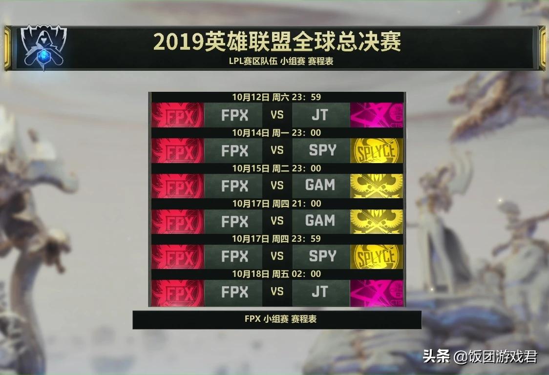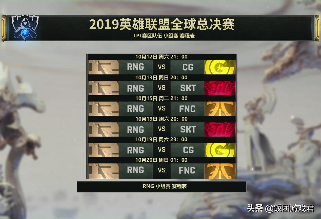 后天(10月12日),S9全球总决赛小组赛正式打响,12支世界顶尖强队和4支从入围赛突围的队伍已经分成A,B,C,D四个小组。对于目前分组情况,相信很多玩家都知道了,A组:G2,GRF,C9和HKA;B组:FPX,JT,GAM和SPY;C组:SKT,RNG,FNC和CG;D组:TL,IG,AHQ和DWG。对于咱们LPL观众,应该最关注的就是三支LPL队伍赛程,下面我们来看看FPX,RNG和IG三支队伍赛程及时间,记得稍微提前一点时间观看,BO1时间长短难以预测。