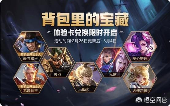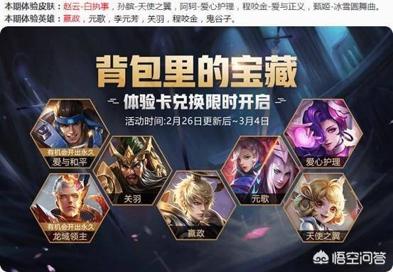 在2月26日更新到3月4日期间,玩家可以通过使用体验卡兑换嬴政体验卡、白执事等体验卡,而本期抽取的两个礼包中的皮肤分别是铠的龙域领主和苏烈的爱与和平!