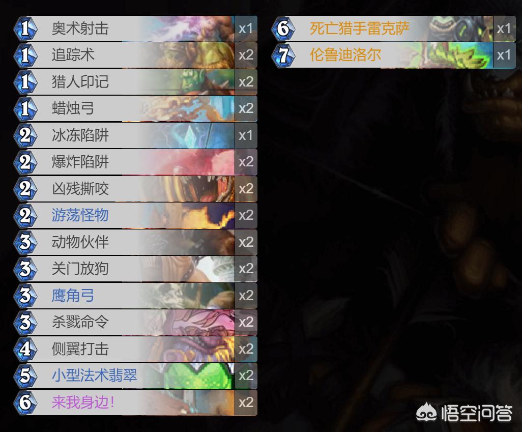 改版前就有很多选手认为这版本法术猎会崛起,果不其然,这是猎人胜率最高也最稳定的卡组,造价也就两橙两紫,为了省尘甚至可以将一张“来我身边”换成别的卡,比如冰冻或者奥术射击。前期靠法术,后期靠dk捏小人,即便对面是控制卡组也会很头疼。