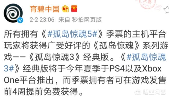 育碧官方宣称的《孤岛惊魂3》经典版是因为《孤岛惊魂5》即将发售,只要是PS4或者XBOXone的玩家只要购买了《孤岛惊魂5》的季票都会免费得《孤岛惊魂3》的游戏。