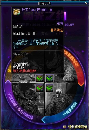 DNF近期更新了一个新的罚站活动,时光之约,当罚站满2小时后,送一个皎玉之哈尔巴特的礼盒,打开后,可以获得一个哈尔巴特的宝箱,2个星空深渊灵石。打开宝箱,最差保底获得增幅器一个,最好的可以获得一个+7,+8,+9,+10的增幅券。