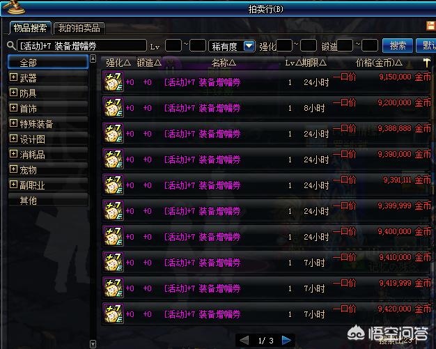 根据笔者在自己所在大区的观察,+10的活动装备增幅券基本上不超过一页,+7的活动装备增幅券差不多在7~8页左右。