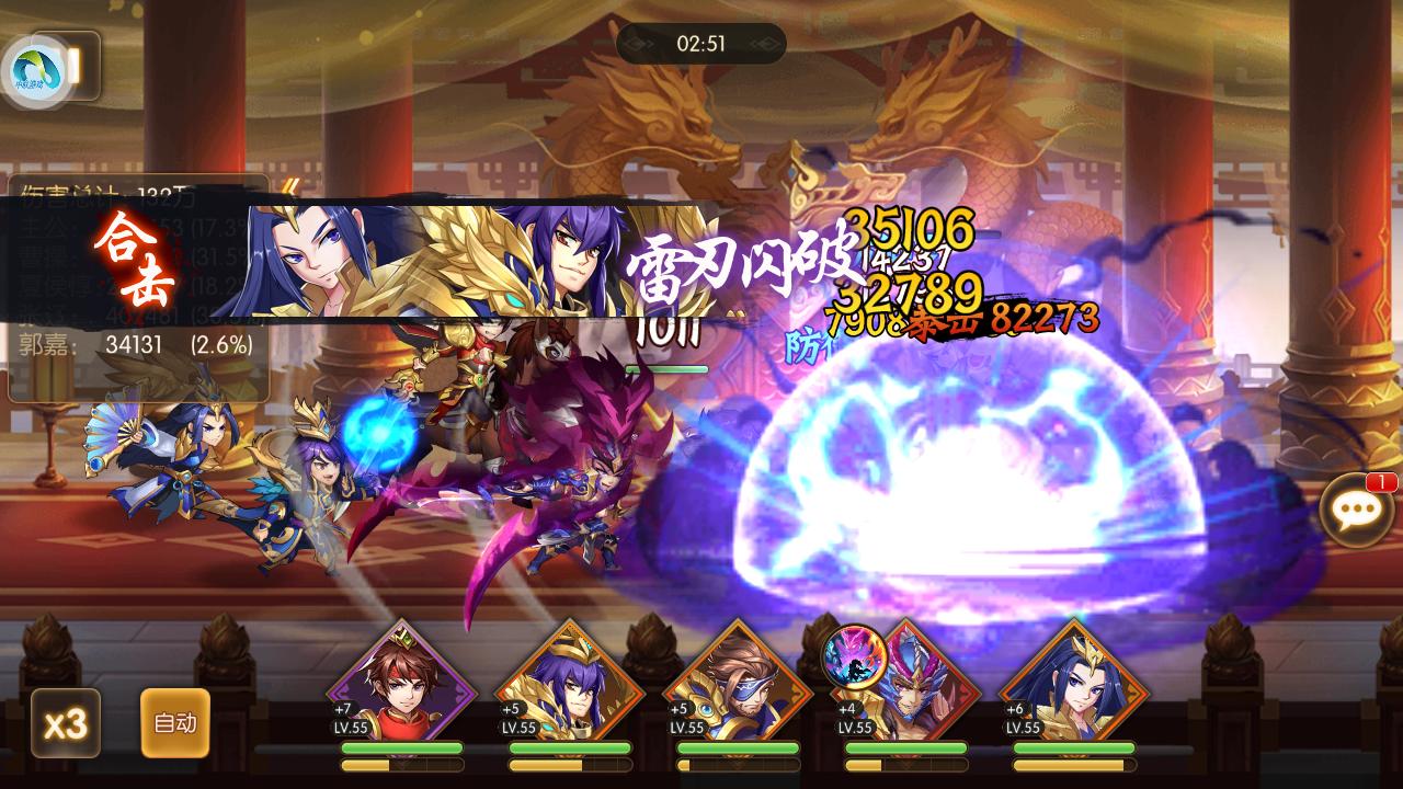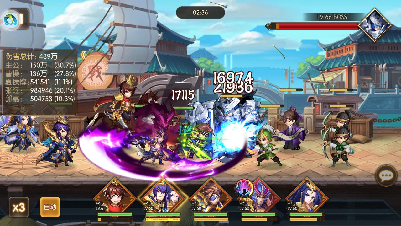 首先看看战斗画面是不是你想要的类型,这款三国游戏战斗采用的是横版对冲模式,所有的战斗都是即时的,战斗数据同屏即时显示,你可以随时看到哪个武将是你的短板。