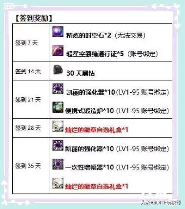 在这次签到奖励中签到7天可以获得2个精炼时空石和5个CXK通行证,签到14天可以获得30天黑钻,签到21天可以获得10个强化器以及10个锻造炉,签到28天可以获得1个灿烂自选徽章,签到35天可以获得10个强化器,增幅器,以及灿烂自选徽章,就奖励对于玩家来说还是非常不错的,光两个灿烂自选礼盒就非常值得签到。