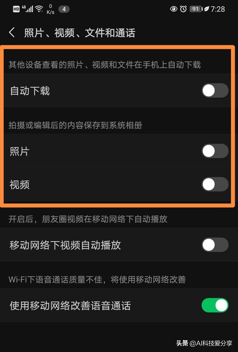 设置方法:微信页面“我”—通用—照片、视频、文件和通话,进入此项把“自动下载”功能关闭,避免群内大量照片和视频下载到手机上,同时也避免了不必要的流量浪费。同样也把“照片、视频保存到相册”功能关闭,一般大家只是在线看看没必要下载到手机,重要文件则可通过手动保存到手机上。