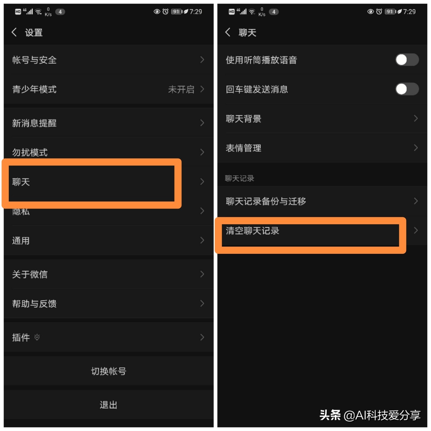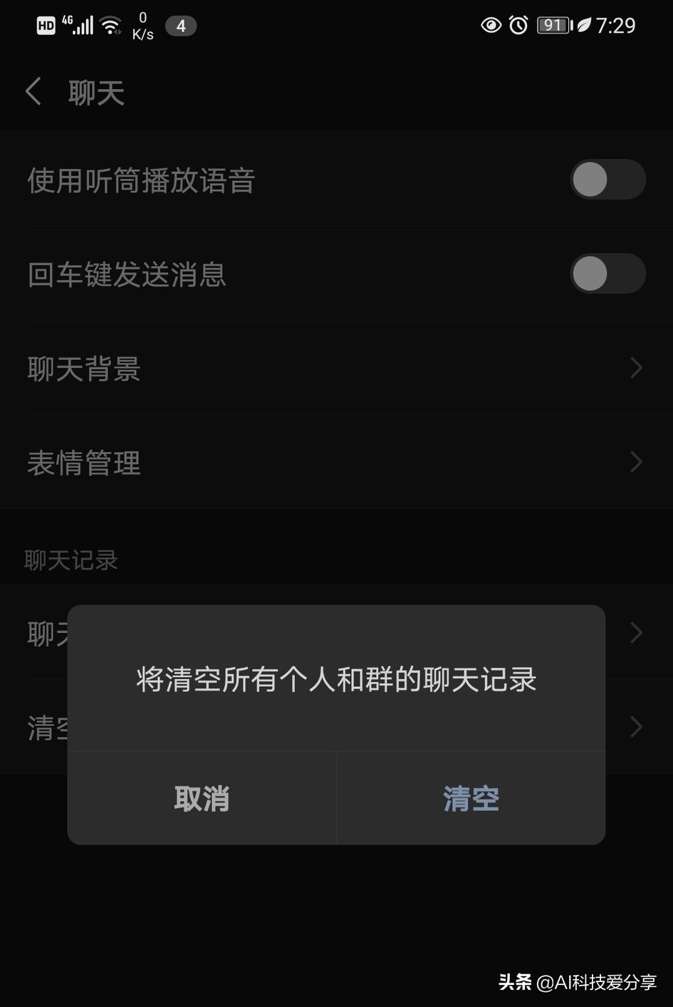 通过以上步骤设置,相信你的手机内存不会那么快让微信塞满。另外,微信聊天记录多了,大家也可手动清理下,方法是在“我”页面选择“聊天”,在聊天记录项选择“清空聊天记录”。