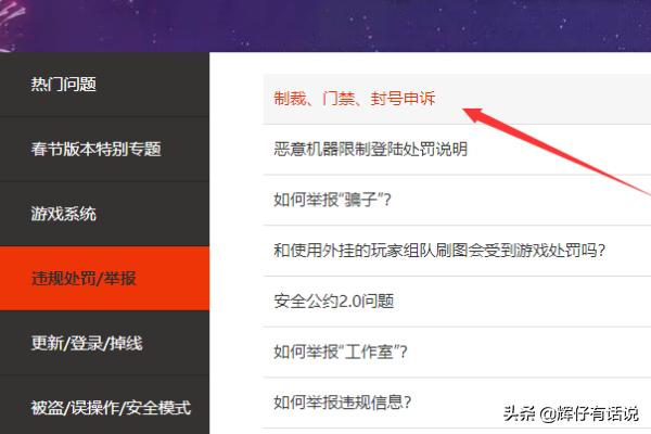 2、点击左侧的“违规处罚,举报”并进入,选择第一项“封号申诉”。