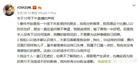 消息一经发出网络上就炸开了锅,虽然Rotk本人及时在网上进行澄清表示自己只是为一个朋友做推荐,并且与LGD队员关系都非常好,日常见面也会互相对骂并不存在侮辱对方;VG俱乐部也在自己官微上公布了Rotk的银行流水,并且澄清Rotk并没有参与菠菜行为,但是依然有许多网友在Rotk道歉微博下表示质疑,言辞犀利引得Rotk不得不认怂表示自己当时只是一时口嗨。