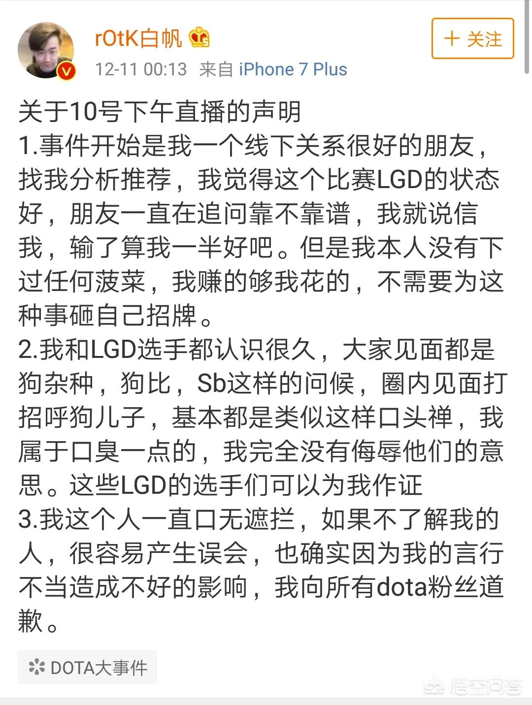 rotk在直播中透露,自己在之前的比赛中压LGD赢的5万后来全输了,而且还骂LGD的选手为狗杂碎之类的词语。在事情暴露之后,rotk火速发微博为自己自证,称是朋友买的,自己只是作为一个参考。