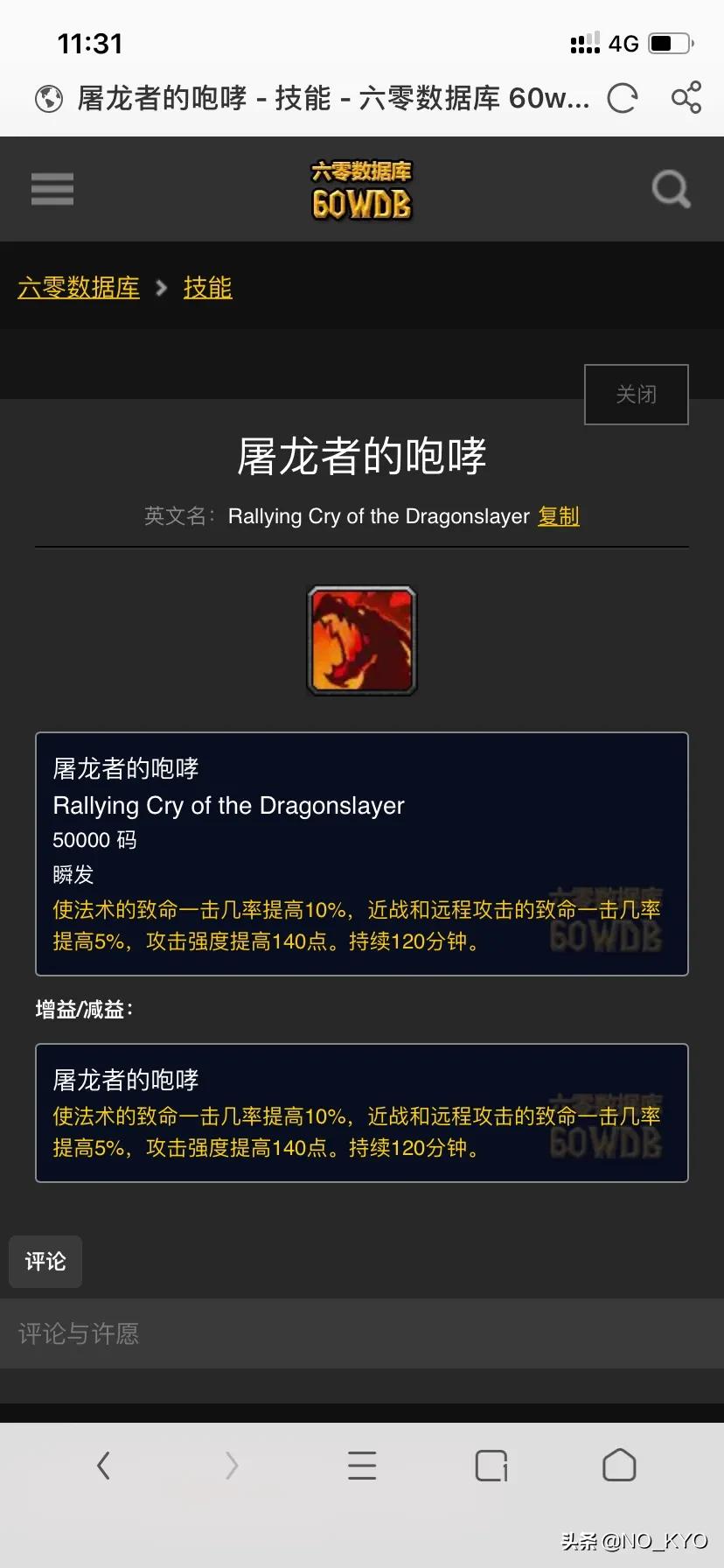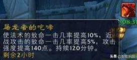 屠龙者的咆哮buff效果:近战和远程攻击的致命一击提高5%,攻击强度提高140点,增加法术爆击10%,持续两小时,死亡后消失。确实是非常强力的世界buff。
