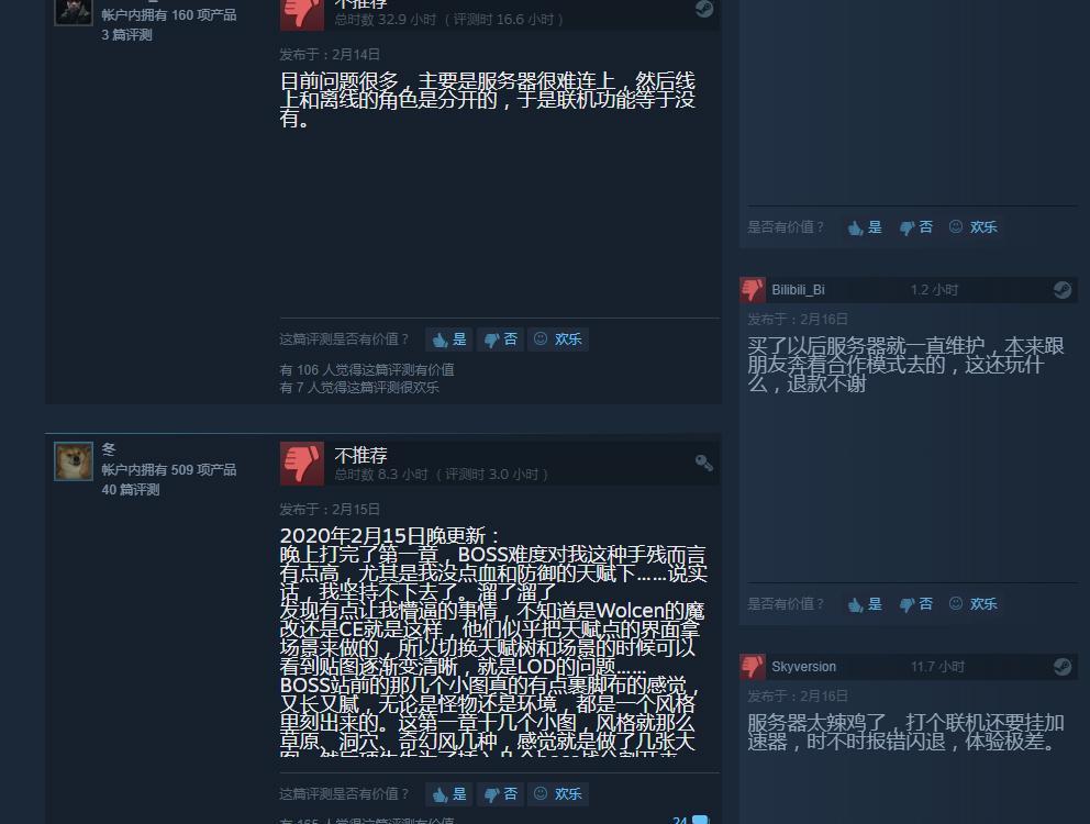根据Steam游戏页面显示,近27000篇评测中,该作的好评率已经降到了62%。大部分玩家都在自己的评价中提到了该作存在的主要问题,特别是在线模式服务器这个问题,不管是好评亦或是差评,要么说服务器很难连上,要么说游戏太卡玩不起来,就算有加速器也存在高延迟。而官方也意识到了服务器这个问题,并且开始着手维护。