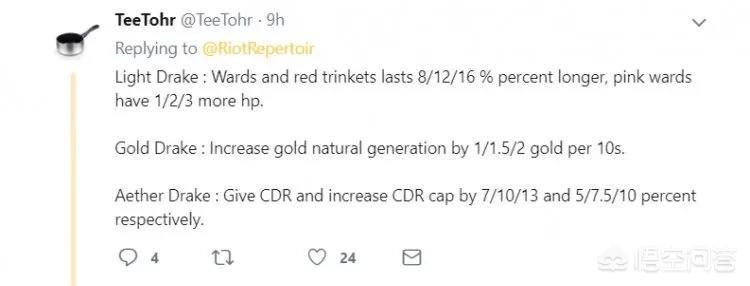 致英雄联盟小龙改版之后,就加快了游戏整体的节奏。距今为止小龙的属性已经有了4条,可分别给击杀的队伍带来不同的效果,其中最为强势的当属火龙可以提高攻击力和法强,其次土龙水龙辅助能力极佳。小龙也有很多时间没有加入新龙了,设计师也是无法拿捏该添加什么样的属性,也是在推特上发表最新消息和大家征集意见。