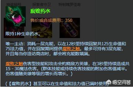 在英雄联盟测试服当中,腐败药水也是受到了改动,这一基本出门装备经过调整之后,前期需要和对方换血的英雄也就要难受了,例如刀妹和武器。老版本的腐败药水拥有3层充能效果,还在测试服当中,充能效果却被砍成了两层,但伤害却提高了,每秒造成魔法伤害上升至全等级20点,生命值回复从125点提升到150点,总回复375降低为300。法力值回复效果从75提升到125,总回复225,最终提升到250。削弱了换血能力加强了耗蓝英雄的赖线能力。当然最难受的也不只是刀妹一个。