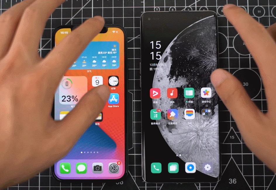 刚好最近看到有网友用OPPO Reno5 Pro和iPhone 12做了对比,截了一些两款手机的动画对比图,可以参考一下。