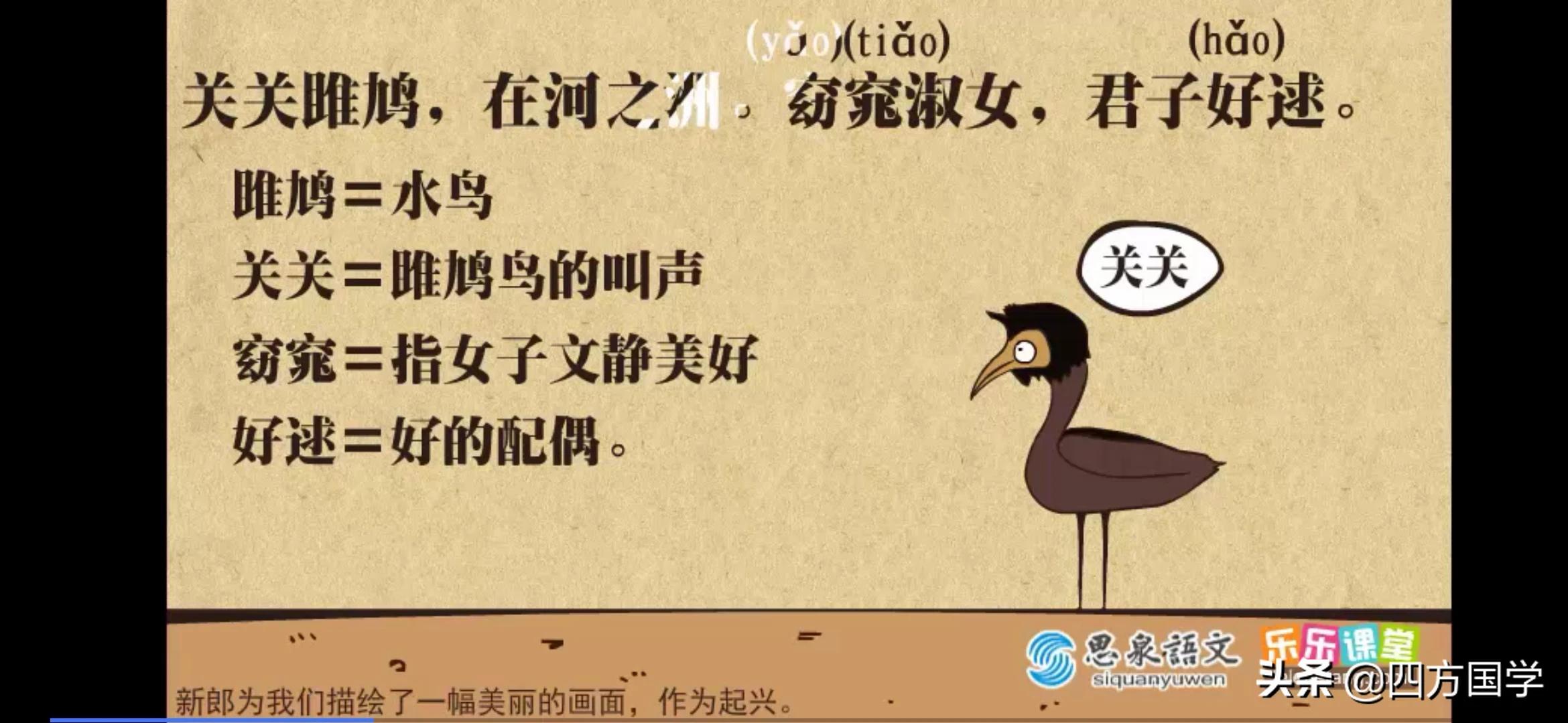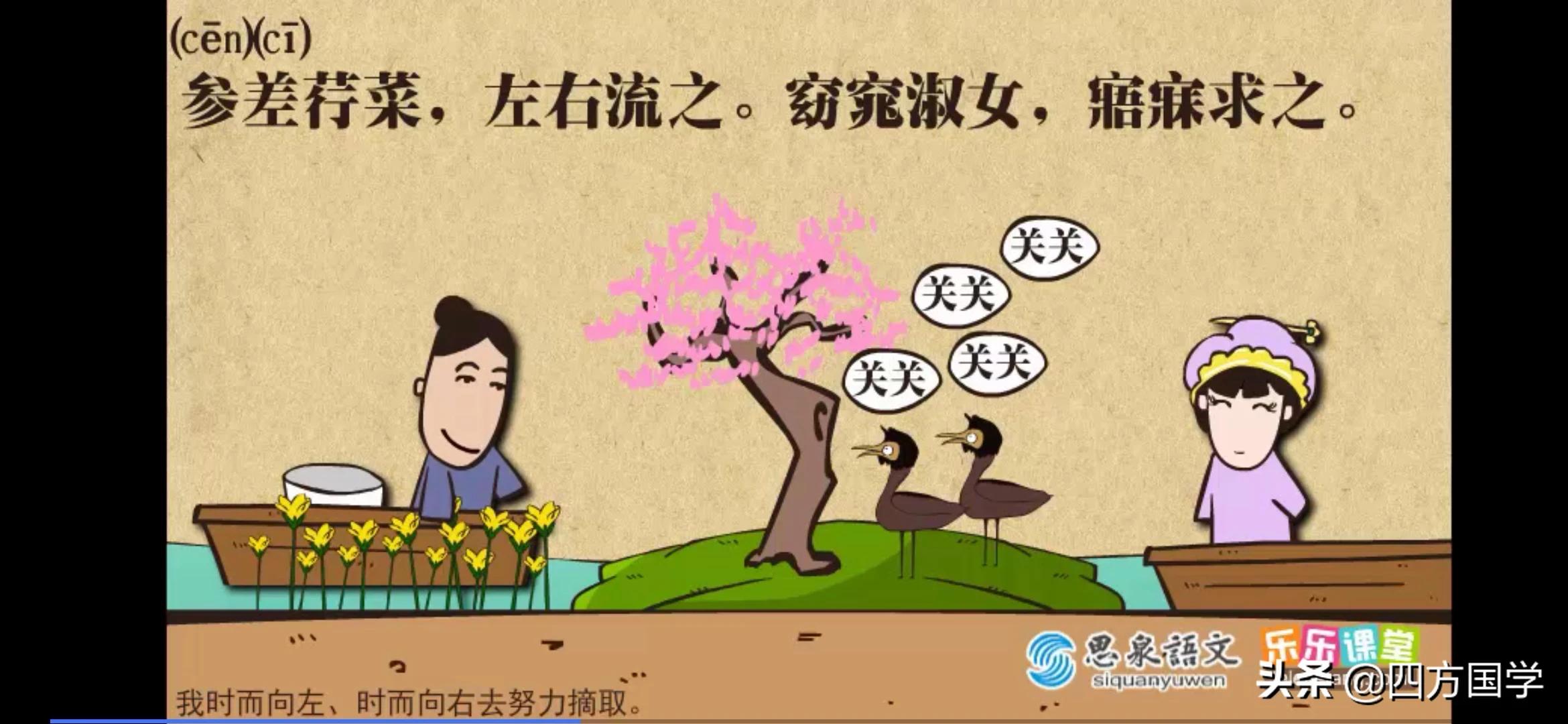 白话文释义:关关和鸣的雎鸠,相伴在河中小洲。美丽贤淑的女子,真是君子好配偶。参差不齐的荇菜,左边右边不停采。美丽贤淑的女子,梦中醒来难忘怀。美好愿望难实现,醒来梦中都思念。想来想去思不断,翻来覆去难入眠。参差不齐的荇菜,左边右边不停摘。美丽贤淑的女子,奏起琴瑟表亲爱。参差不齐的荇菜,左边右边去拔它。美丽贤淑的女子,鸣钟击鼓取悦她。