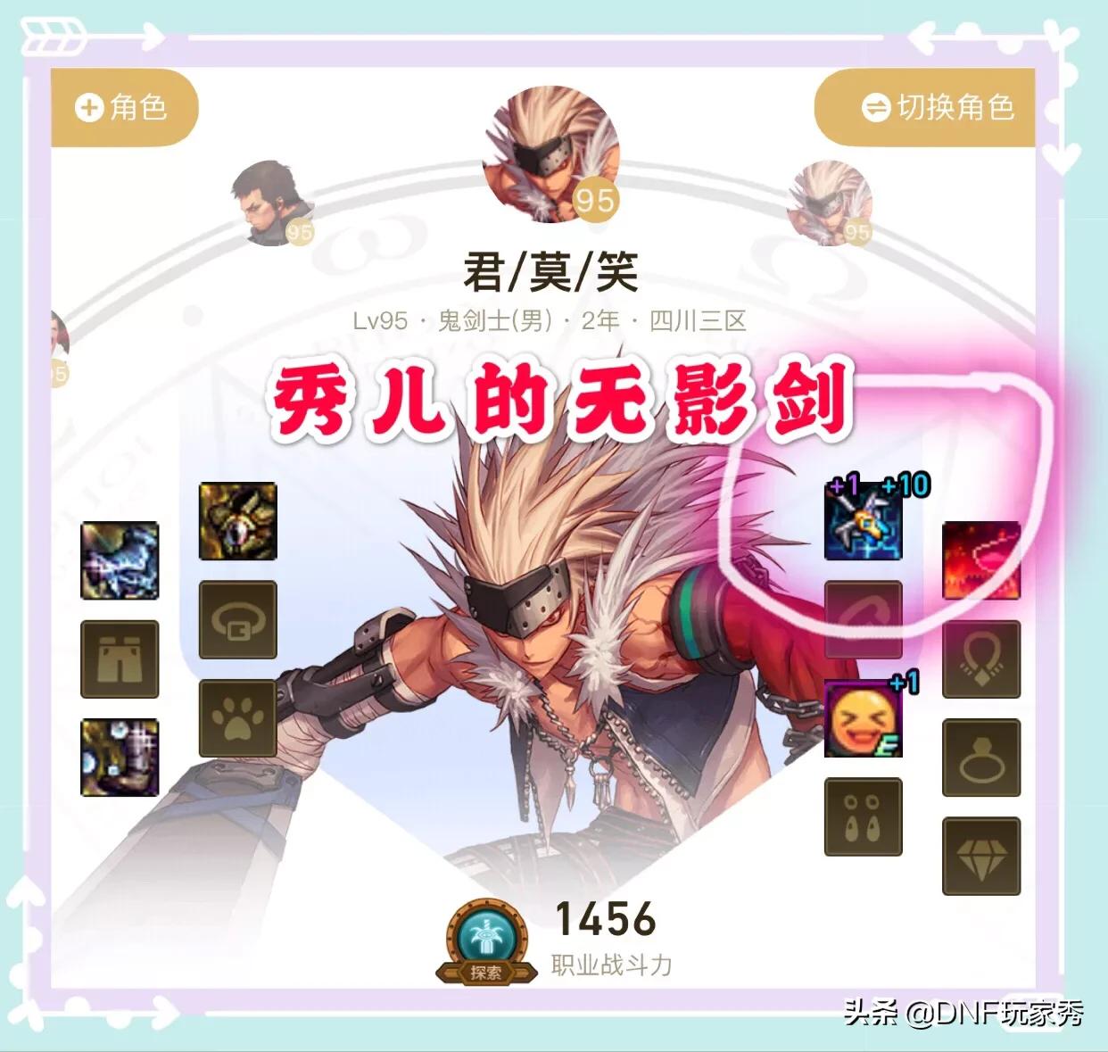秀儿最开始玩的角色是狂战,但非常遗憾,深渊没有爆出无影剑!后来看Lip的视频被诱惑,转战女气功了,就更没有花狗眼去兑换无影剑了。直到后来90版本出史诗之路活动,秀儿才换了一把改版后的假无影剑,给了当时心血来潮玩的一个没有转职的鬼剑士。但是,后来也被我放弃了这个角色,装备全部碎了,就留下了这把无影剑!