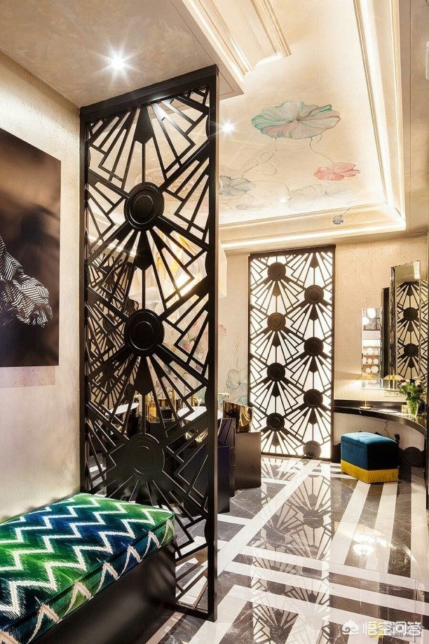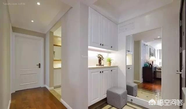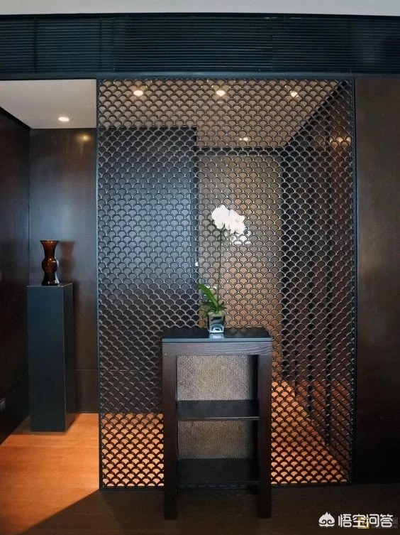 第一种在进户门附近做屏风:屏风在进门处,根据具体结构做一个L型玄关,集成鞋柜和屏风的功能。