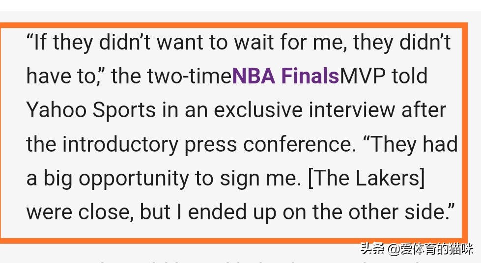 对紫金湖人球迷来说,伦纳德的做法已经引起了他们的愤怒,因为在他们看来,湖人在得到他的概率上一直处于领先位置,但伦纳德不这样看,他说“如果他们不想等我,他们就不用等了,”伦纳德在新闻发布会后接受了雅虎体育的独家采访。“他们有很大的机会签下我。湖人队已经很接近了,但我最终还是站在了另一边(快船)。”但伦纳德很可能会选择湖人,如果快船队没有找到一种方法来赢得这场轰动交易的话,联盟消息人士告诉雅虎体育。
